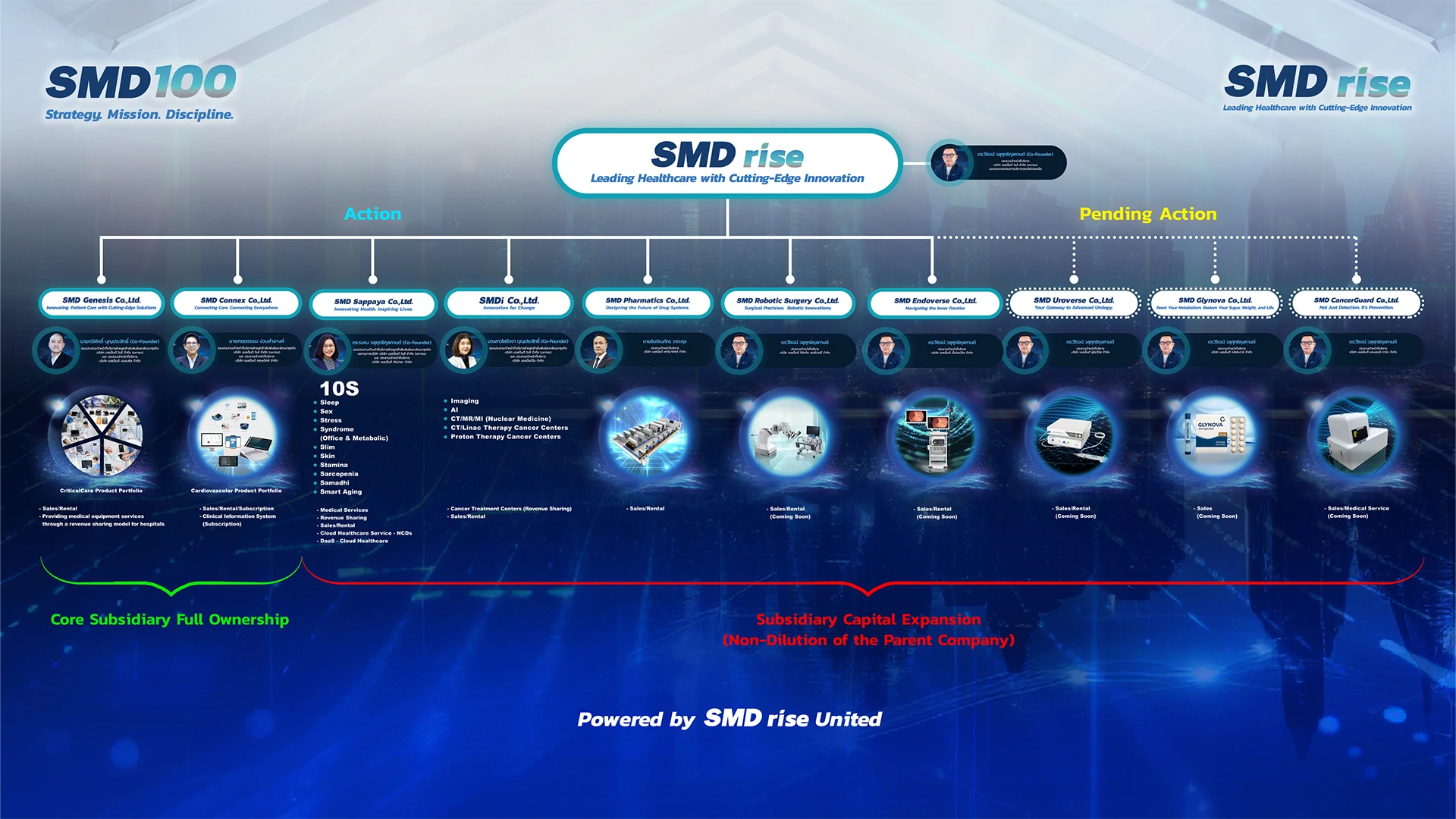 ทั้งนี้ บริษัท เอสเอ็มดี ไอ จำกัด ได้ลงนามบันทึกความเข้าใจ (MOU) กับโรงพยาบาลธรรมศาสตร์ เฉลิมพระเกียรติในโครงการศูนย์บำบัดมะเร็งด้วยเทคโนโลยี Proton Therapy โดยโครงการนี้ถือเป็นความร่วมมือที่สำคัญในการขยายขีดความสามารถด้านการแพทย์ของประเทศไทย พร้อมยกระดับการรักษาให้ได้มาตรฐานระดับสากล ซึ่งโครงการนี้จะเป็นตัวอย่างของการลงทุนที่มีผลตอบแทนเชิงเศรษฐกิจควบคู่กับผลกระทบเชิงสังคม หรือ Financial Returns with Social Impact โดยแสดงให้เห็นถึงความสมดุลระหว่างการสร้างผลตอบแทนทางธุรกิจและการยกระดับ คุณภาพชีวิตของประชาชน - บริษัท เอสเอ็มดี คอนเน็กซ์ จำกัด (SMD Connex Co., Ltd.) ดูแลผลิตภัณฑ์ในกลุ่ม Cardiovascular Product Portfolio และระบบ Clinical Information Portfolio และระบบ Clinical Information System (CIS) โดยเน้นการเชื่อมโยงข้อมูลจากอุปกรณ์ทางการแพทย์สู่ระบบดิจิทัล ดำเนินธุรกิจผ่านโมเดลขาย การเช่า และการสมัครสมาชิก (Subscription)