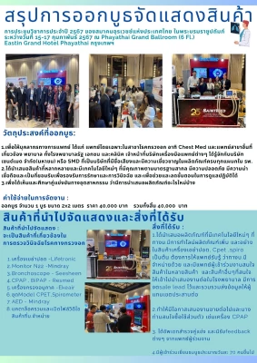 | กิจกรรม : | การเข้าร่วมการออกบูธ ชมรมกายภาพบำบัดระบบหายใจและหลอดเลือดแห่งประเทศไทย |