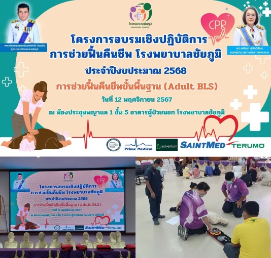 บริษัทฯ ให้การสนับสนุน โครงการอบรมเชิงปฏิบัติการช่วยฟื้นคืนชีพ (Cardiopulmonary Resuscitation - CPR) ณ โรงพยาบาลชัยภูมิ เพื่อเสริมสร้างความรู้และทักษะการช่วยชีวิตขั้นพื้นฐานแก่บุคลากรทางการแพทย์ เจ้าหน้าที่ และผู้ที่เกี่ยวข้อง โดยเนื้อหาการอบรมครอบคลุมการทำ CPR อย่างถูกต้อง การใช้เครื่องกระตุกหัวใจไฟฟ้าอัตโนมัติ (AED) และแนวทางการช่วยเหลือผู้ป่วยในภาวะฉุกเฉิน