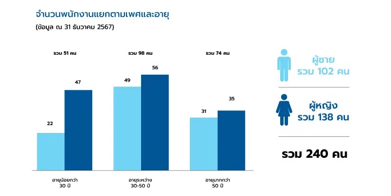 1. การจ้างงานที่เป็นธรรมและปราศจากการเลือกปฏิบัติในทุกรูปแบบ โดยดำเนินนโยบายการจ้างงานที่เคารพความหลากหลาย และโอกาสที่เท่าเทียม โดยไม่แบ่งแยกเพศ อายุ เชื้อชาติ ศาสนา หรือความแตกต่างอื่น ๆ โดยปฏิบัติตามหลักสิทธิมนุษยชนและกฎหมายแรงงานอย่างเคร่งครัด รวมถึงมีมาตรการป้องกัน การใช้แรงงานเด็กและแรงงานบังคับ ในทุกกระบวนการขององค์กร นอกจากนี้ บริษัทฯ ยังให้ความสำคัญกับ การส่งเสริมการจ้างงานบุคคลทุพพลภาพ เพื่อสนับสนุนโอกาสในการทำงานของกลุ่มบุคคลที่มีความสามารถและศักยภาพแต่ถูกจำกัดด้วยเงื่อนไขทางกายภาพ ซึ่งในปี 2567 บริษัทฯ ได้ดำเนินการจ้างงานบุคคลทุพพลภาพจำนวน 2 คน ตามข้อกำหนดของ พระราชบัญญัติส่งเสริมและพัฒนาคุณภาพชีวิตคนพิการ พ.ศ. 2550 และกฎหมายที่เกี่ยวข้อง เพื่อเป็นการสร้างสังคมที่มีความเท่าเทียม และช่วยให้บุคคลทุพพลภาพสามารถมีส่วนร่วมในระบบเศรษฐกิจและพัฒนาตนเองได้อย่างยั่งยืน